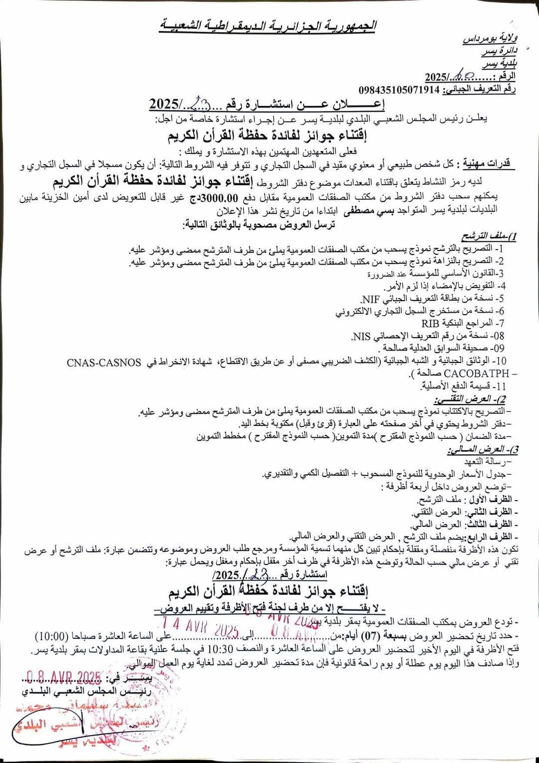 يعلن رئيس المجلس الشعبي البلدي لبلدية يسر، عن اجراء استشارة رقم 23
