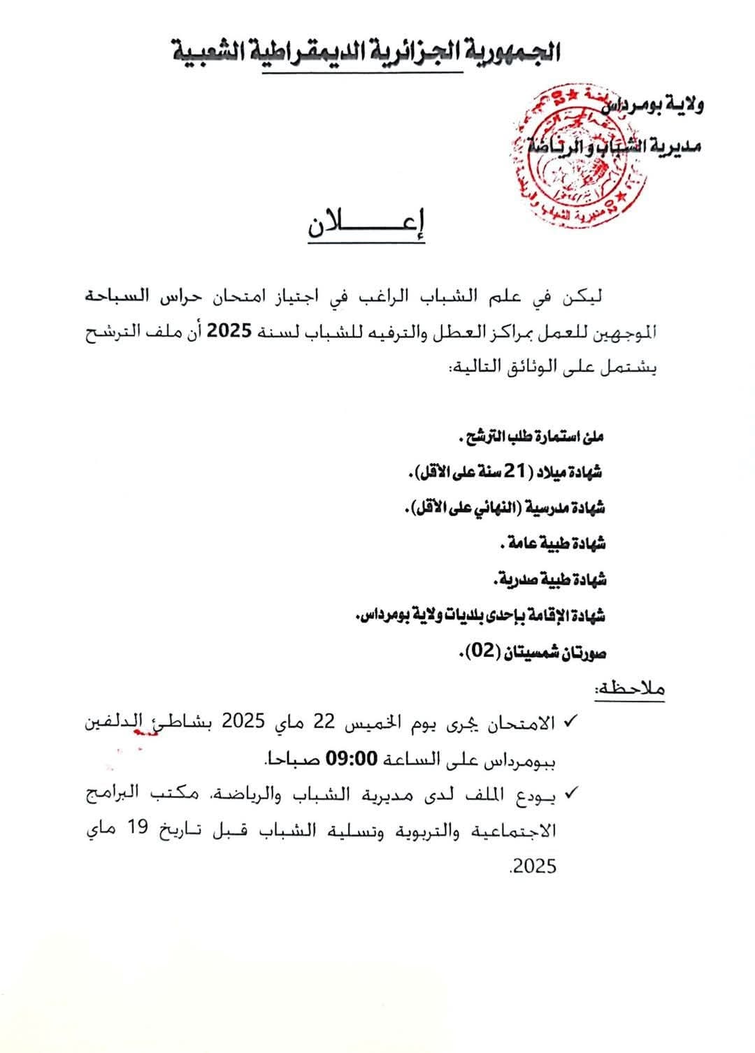 إعلان مديرية الشباب و الرياضة، امتحان حراس السباحة
