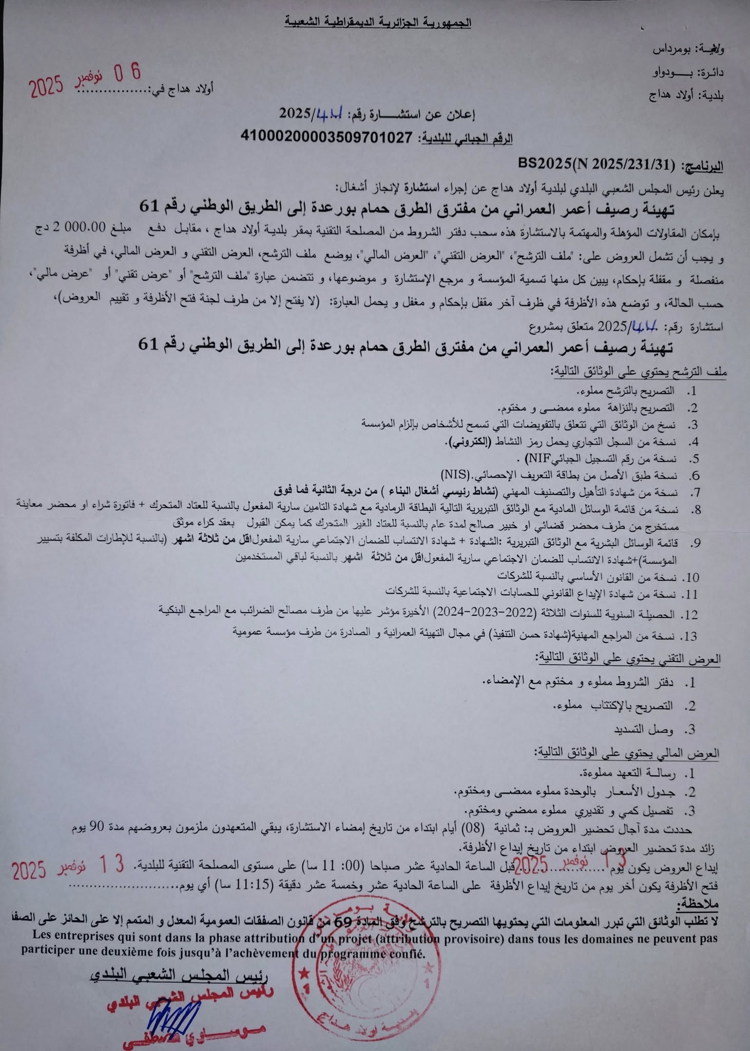 يعلن رئيس المجلس الشعبي البلدي لبلدية اولاد هداج، عن اجراء استشارة رقم 43