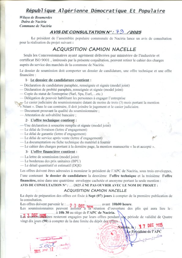 :يعلن السيد رئيس المجلس الشعبي البلدي لبلدية الناصرية عن الاستشارة رقم 79 لانجاز المشروع التالي