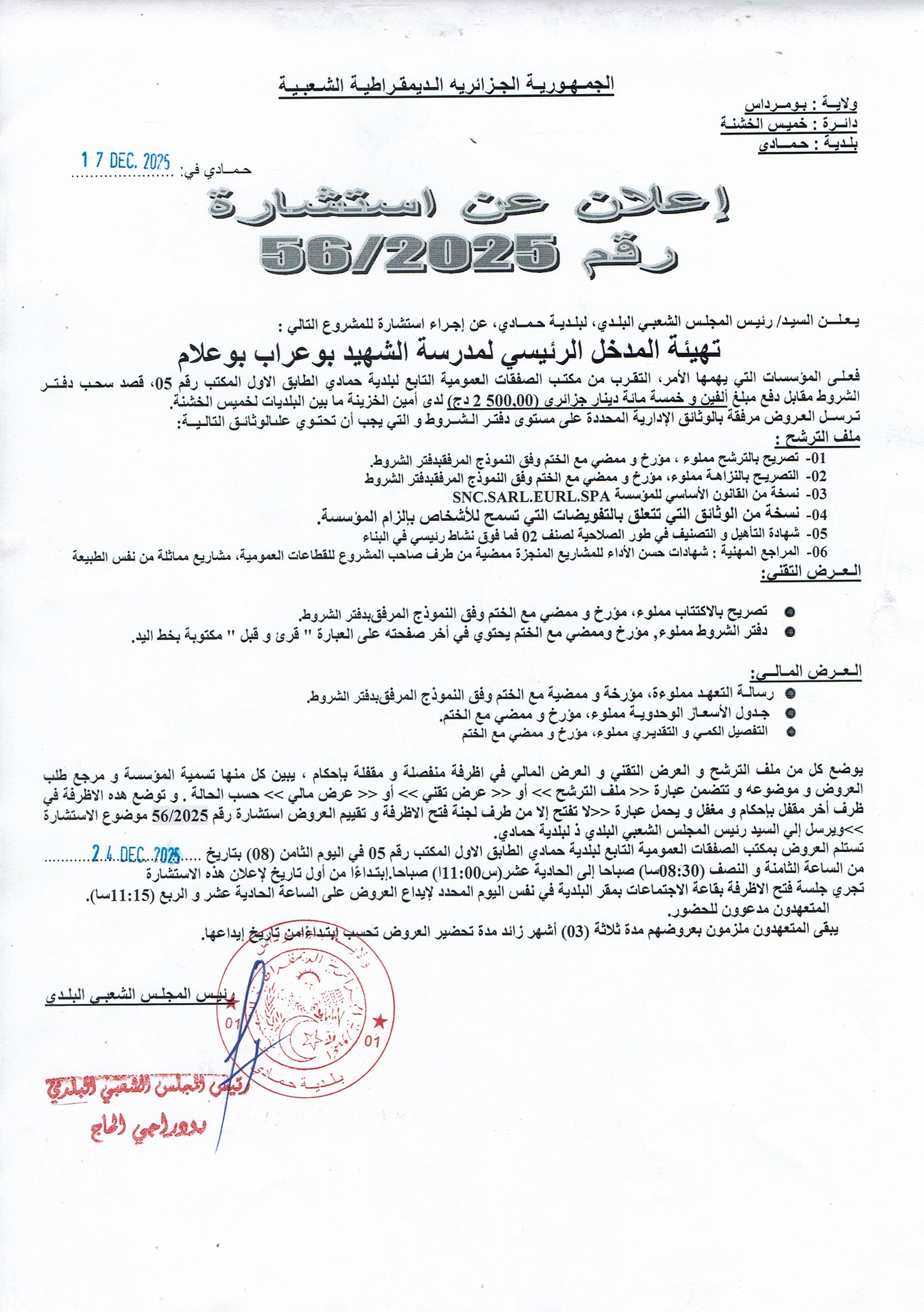 :يعلن السيد رئيس المجلس الشعبي البلدي لبلدية حمادي عن الاستشارة رقم 56 لانجاز المشروع التالي