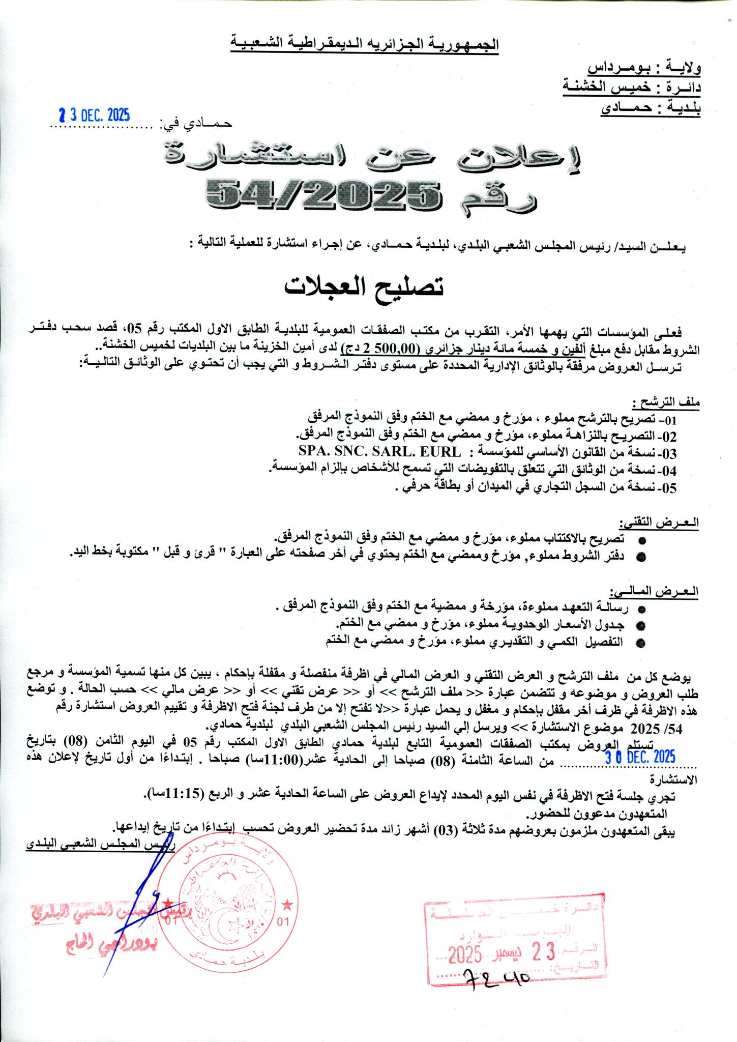 :يعلن السيد رئيس المجلس الشعبي البلدي لبلدية حمادي عن الاستشارة رقم 54 لانجاز المشروع التالي