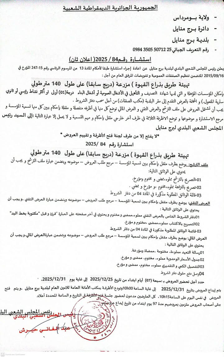 :يعلن السيد رئيس المجلس الشعبي البلدي لبلدية برج منايل عن الاستشارة رقم 84 لانجاز المشروع التالي