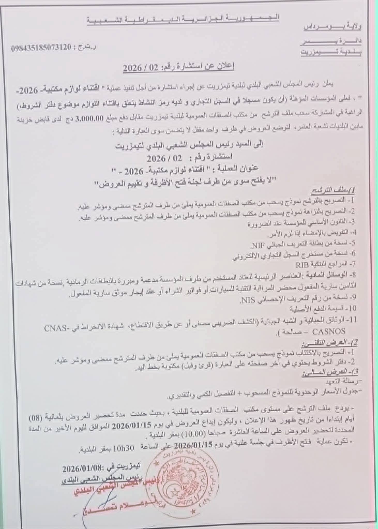 :يعلن السيد رئيس المجلس الشعبي البلدي لبلدية تيمزريت عن الاستشارة رقم 02 لانجاز المشروع التالي