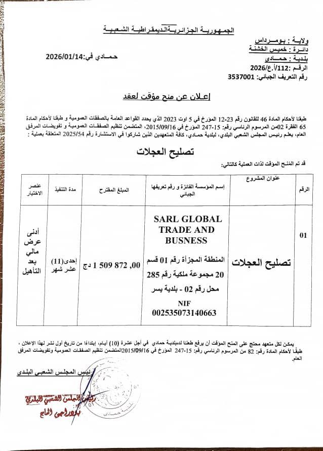 يعلن رئيس المجلس الشعبي البلدي لبلدية حمادي عن منح مؤقت لعقد عملية تصليح العجلات