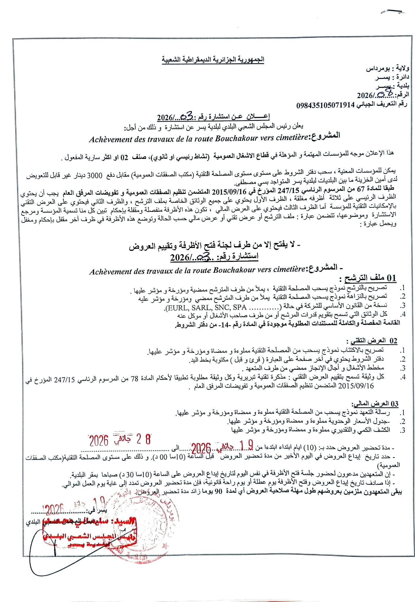:يعلن السيد رئيس المجلس الشعبي البلدي لبلدية يسر عن الاستشارة رقم 03 لانجاز المشروع التالي