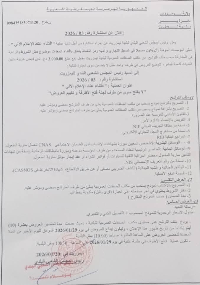 :يعلن السيد رئيس المجلس الشعبي البلدي لبلدية تيمزريت عن الاستشارة رقم 03 لانجاز المشروع التالي