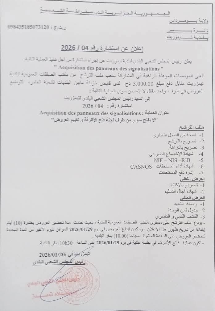 :يعلن السيد رئيس المجلس الشعبي البلدي لبلدية تيمزريت عن الاستشارة رقم 04 لانجاز المشروع التالي