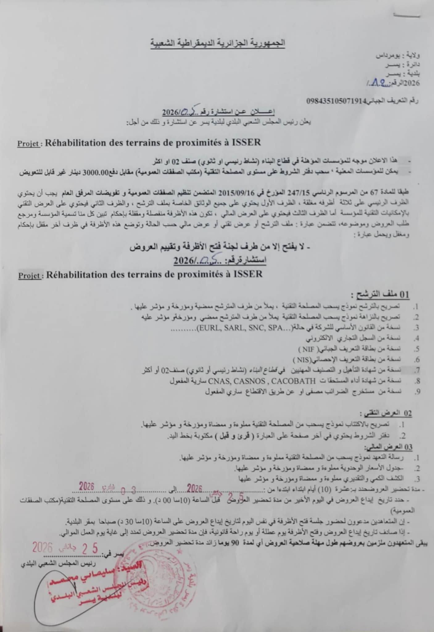 يعلن السيد رئيس المجلس الشعبي البلدي لبلدية يسر عن الاستشارة رقم 05 لانجاز المشروع التالي