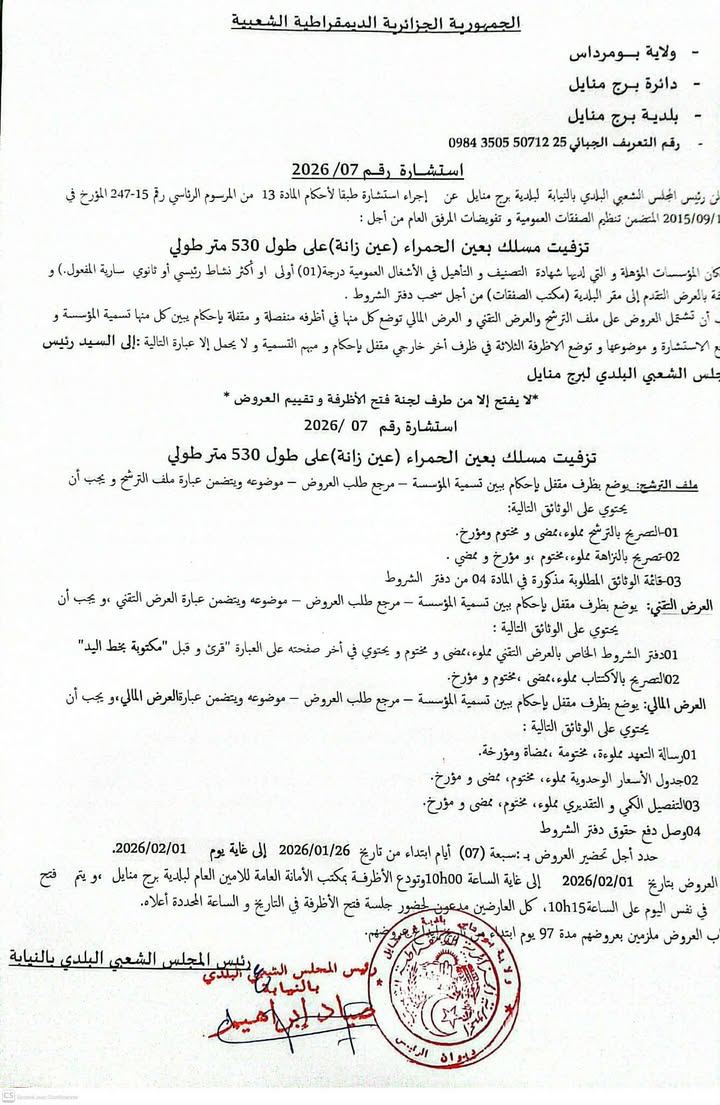 يعلن السيد رئيس المجلس الشعبي البلدي لبلدية برج منايل عن الاستشارة رقم 07 لانجاز المشروع التالي
