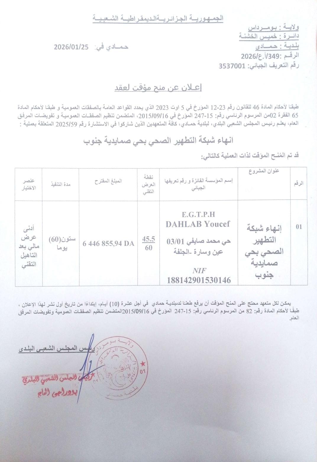 يعلن رئيس المجلس الشعبي البلدي لبلدية حمادي عن منح مؤقت لعقد انهاء شبكة التطهير الصحي بحي صمايدية جنوب