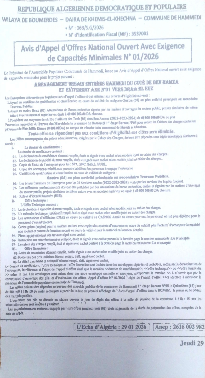 يعلن السيد رئيس المجلس الشعبي البلدي لبلدية حمادي عن طلب وطني مفتوح مع اشتراط قدرات دنيا رقم 01 لانجاز المشروع التالي