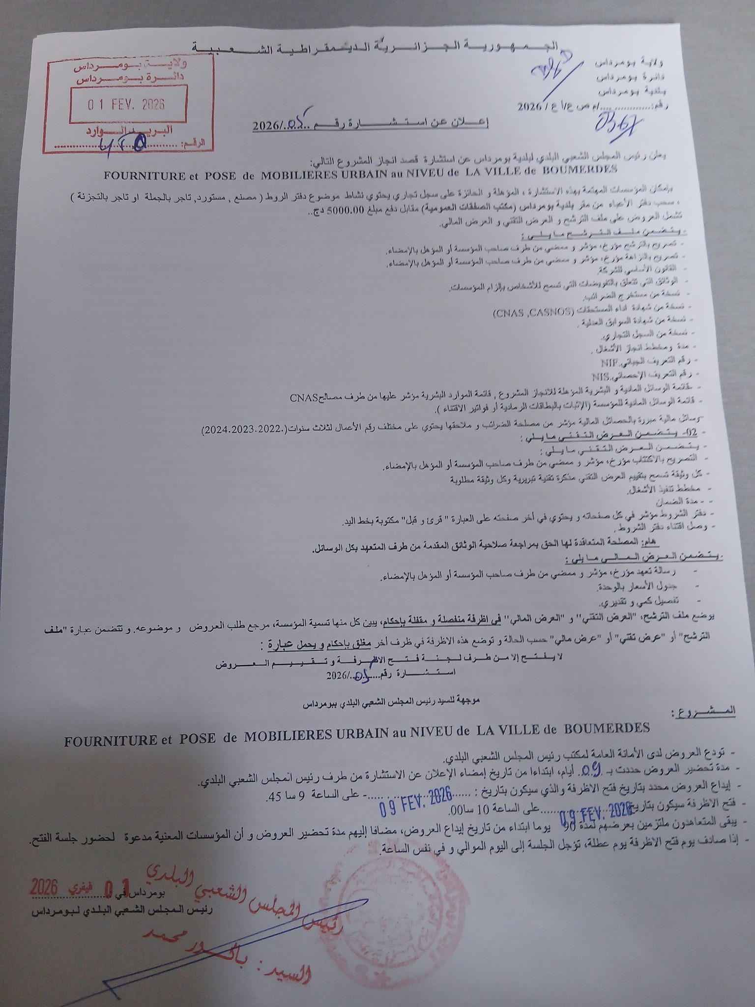 :يعلن السيد رئيس المجلس الشعبي البلدي لبلدية بومرداس عن الاستشارة رقم 05 لانجاز المشروع التالي