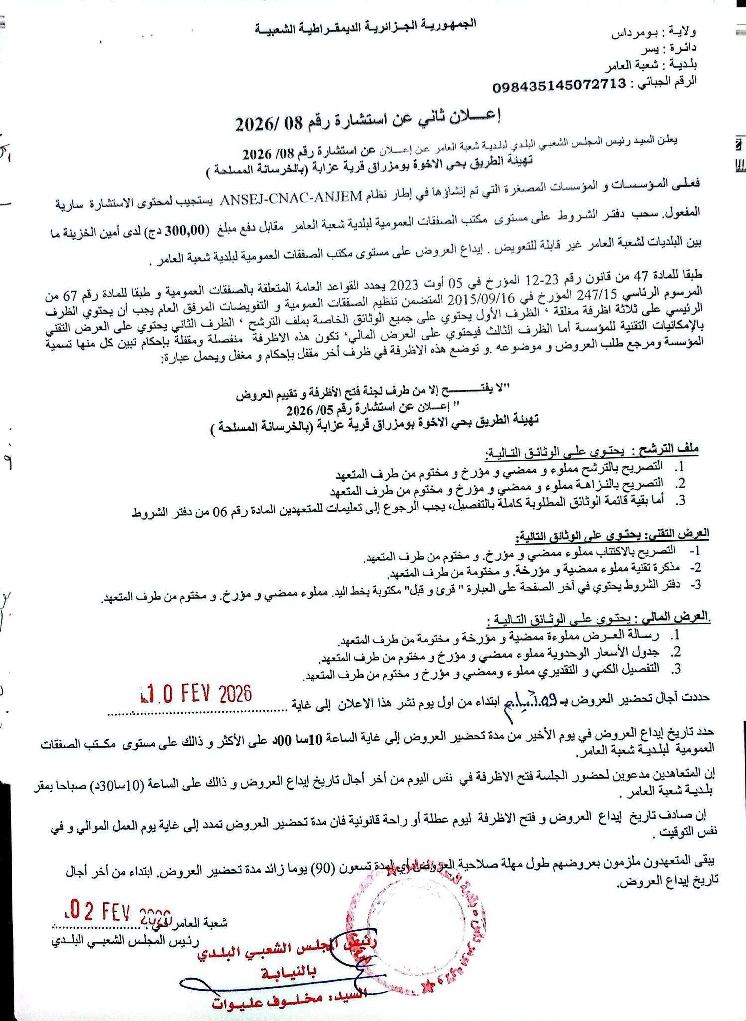 :يعلن السيد رئيس المجلس الشعبي البلدي لبلدية شعبة العامر عن الاستشارة رقم 08 لانجاز المشروع التالي