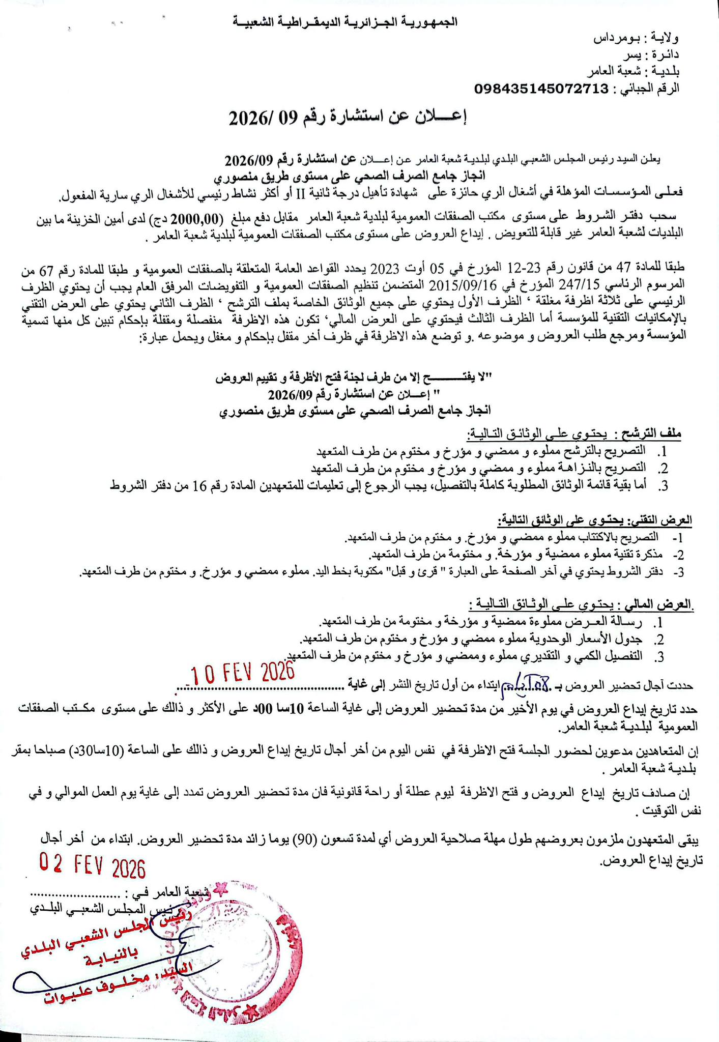 :يعلن السيد رئيس المجلس الشعبي البلدي لبلدية شعبة العامر عن الاستشارة رقم 08 لانجاز المشروع التالي