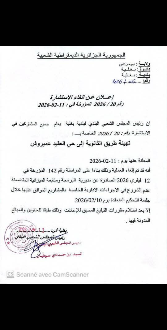 :يعلن السيد رئيس المجلس الشعبي البلدي لبلدية بغلية عن إلغاء الاستشارة رقم 20 لانجاز المشروع التالي