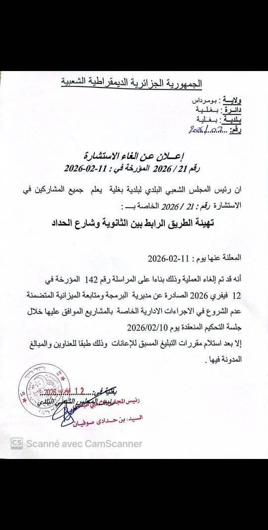 :يعلن السيد رئيس المجلس الشعبي البلدي لبلدية بغلية عن إلغاء الاستشارة رقم 21 لانجاز المشروع التالي