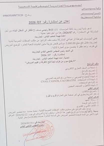 يعلن السيد رئيس المجلس الشعبي البلدي لبلدية تيمزريت عن الاستشارة رقم 07 لانجاز المشروع التالي