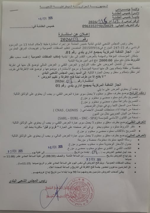يعلن السيد رئيس المجلس الشعبي البلدي لبلدية خميس الخشنة عن الاستشارة رقم 03 لانجاز المشروع التالي