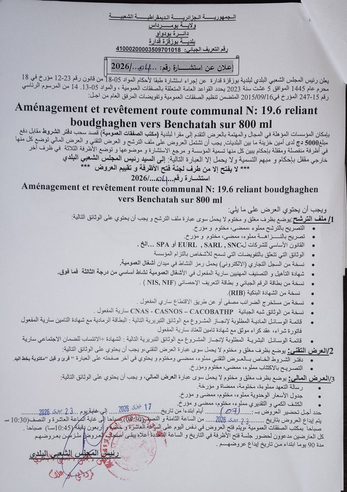 يعلن السيد رئيس المجلس الشعبي البلدي لبلدية بوزقزة قدارة عن الاستشارة رقم 04 لانجاز المشروع التالي