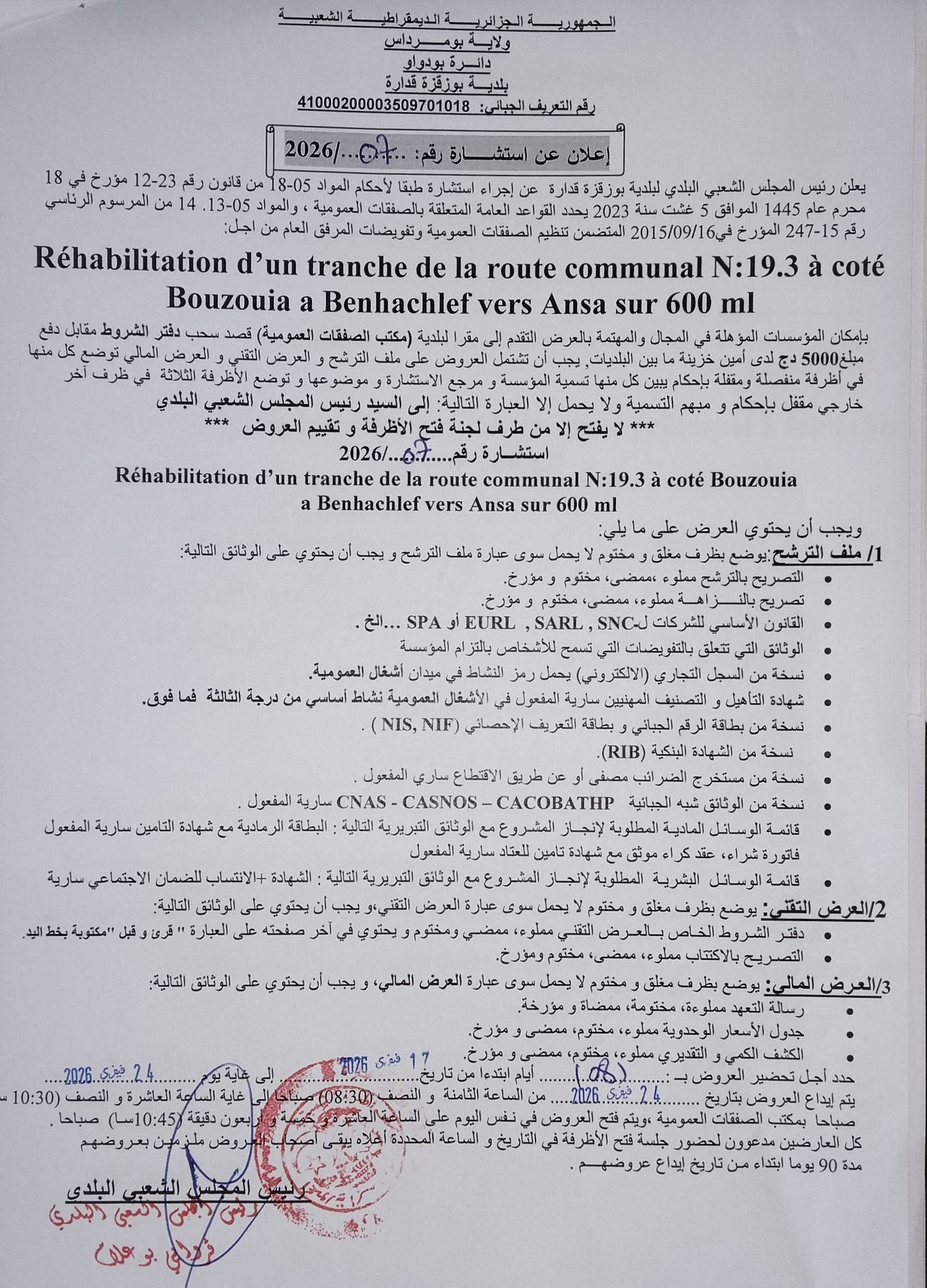 يعلن السيد رئيس المجلس الشعبي البلدي لبلدية بوزقزة قدارة عن الاستشارة رقم 07 لانجاز المشروع التالي