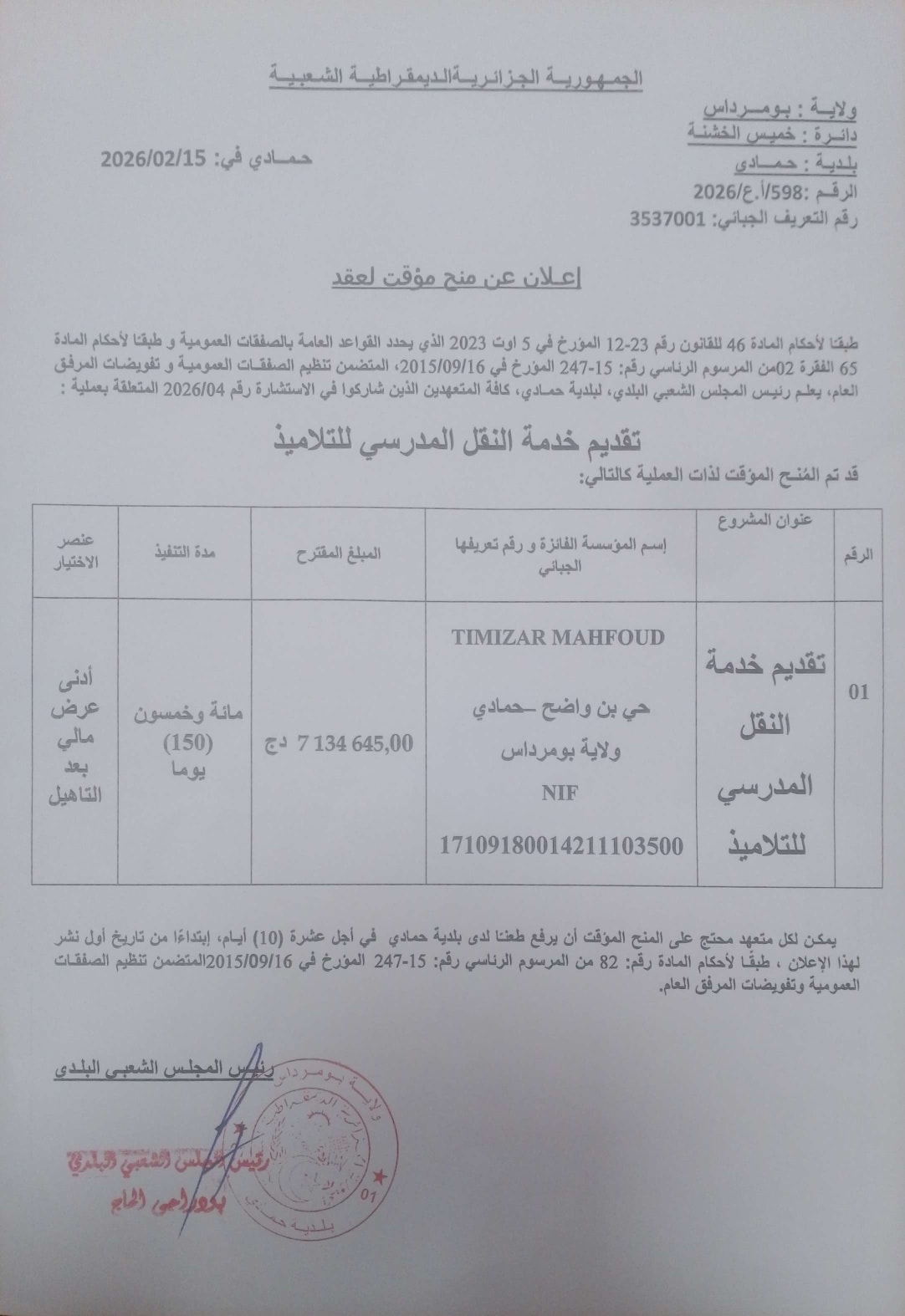 يعلن السيد رئيس المجلس الشعبي البلدي لبلدية حمادي عن اعلان عن منح مؤقت لعقد لانجاز المشروع التالي