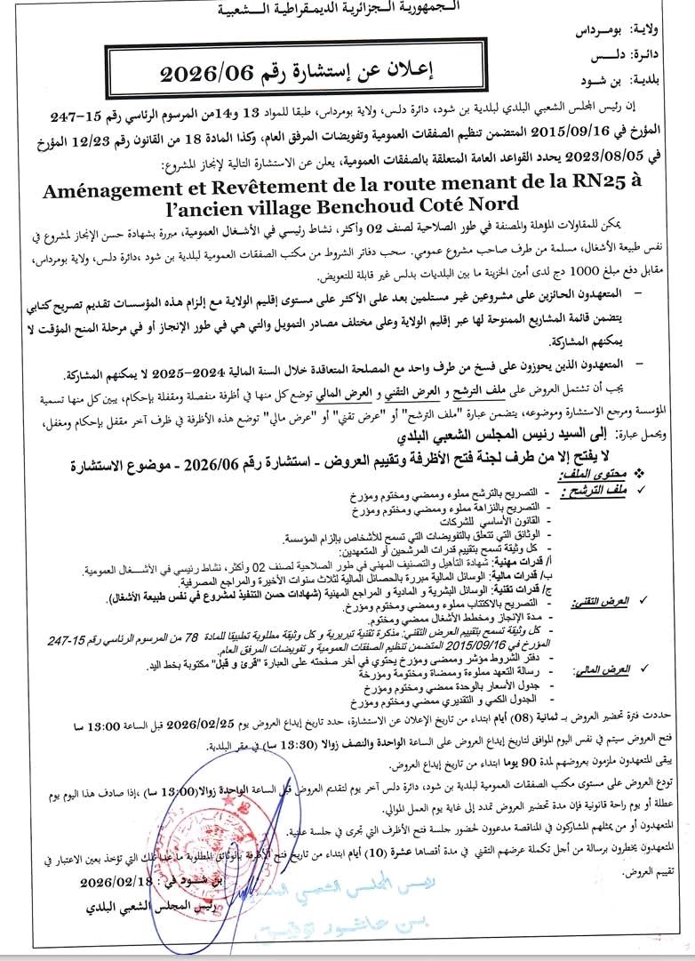 يعلن السيد رئيس المجلس الشعبي البلدي لبلدية بن شود عن الاستشارة رقم 06 لانجاز المشروع التالي