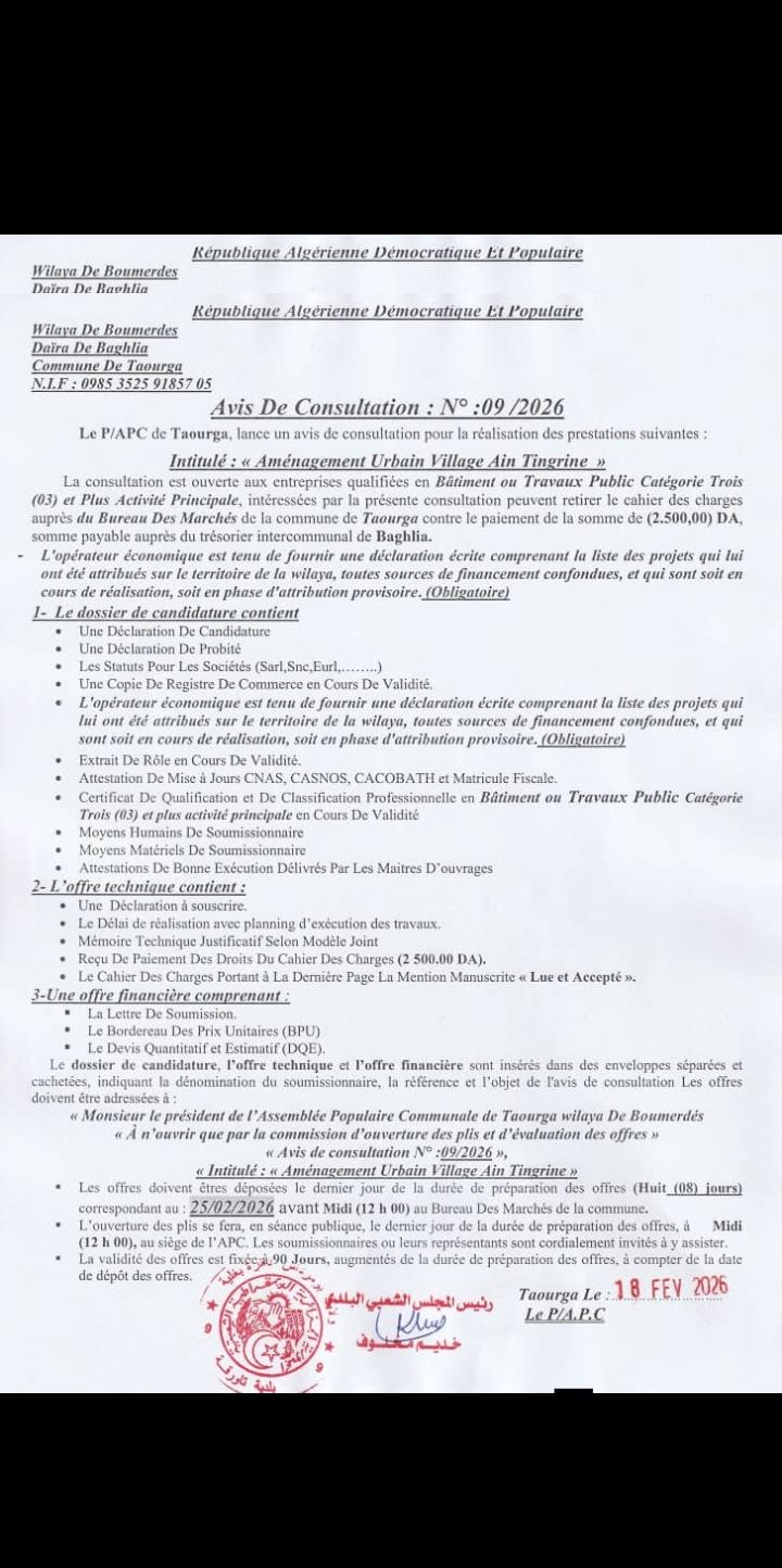يعلن السيد رئيس المجلس الشعبي البلدي لبلدية تاورقة عن الاستشارة رقم 09 لانجاز المشروع التالي