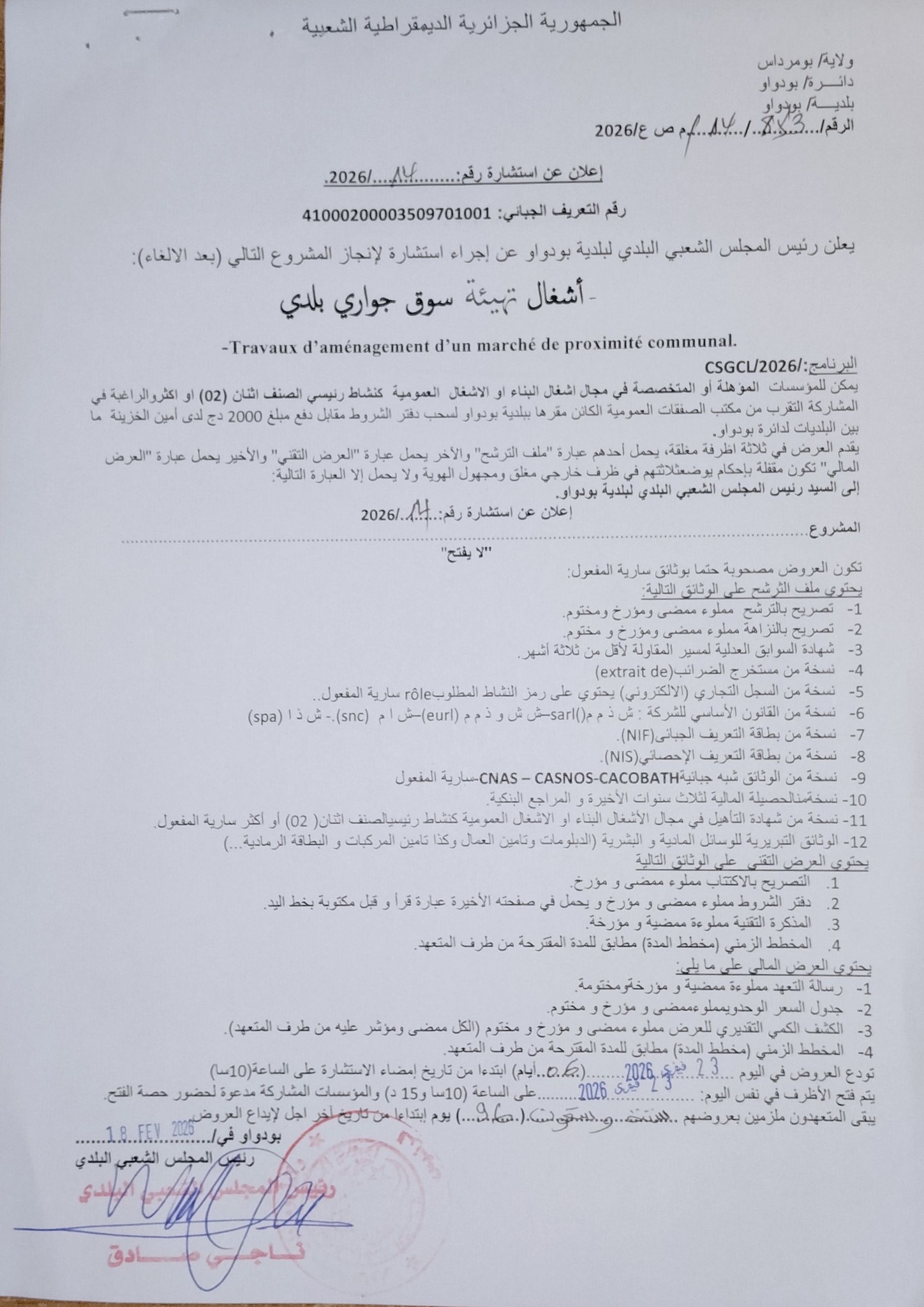 يعلن السيد رئيس المجلس الشعبي البلدي لبلدية بودواو عن الاستشارة رقم 14 لانجاز المشروع التالي