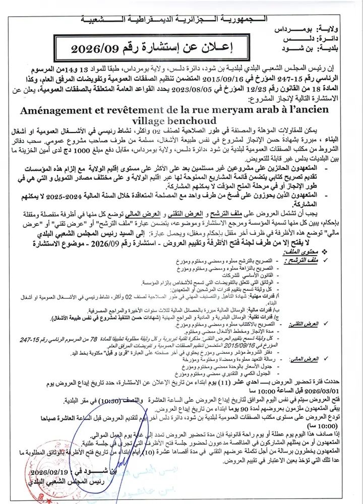 يعلن السيد رئيس المجلس الشعبي البلدي لبلدية بن شود عن الاستشارة رقم 09 لانجاز المشروع التالي