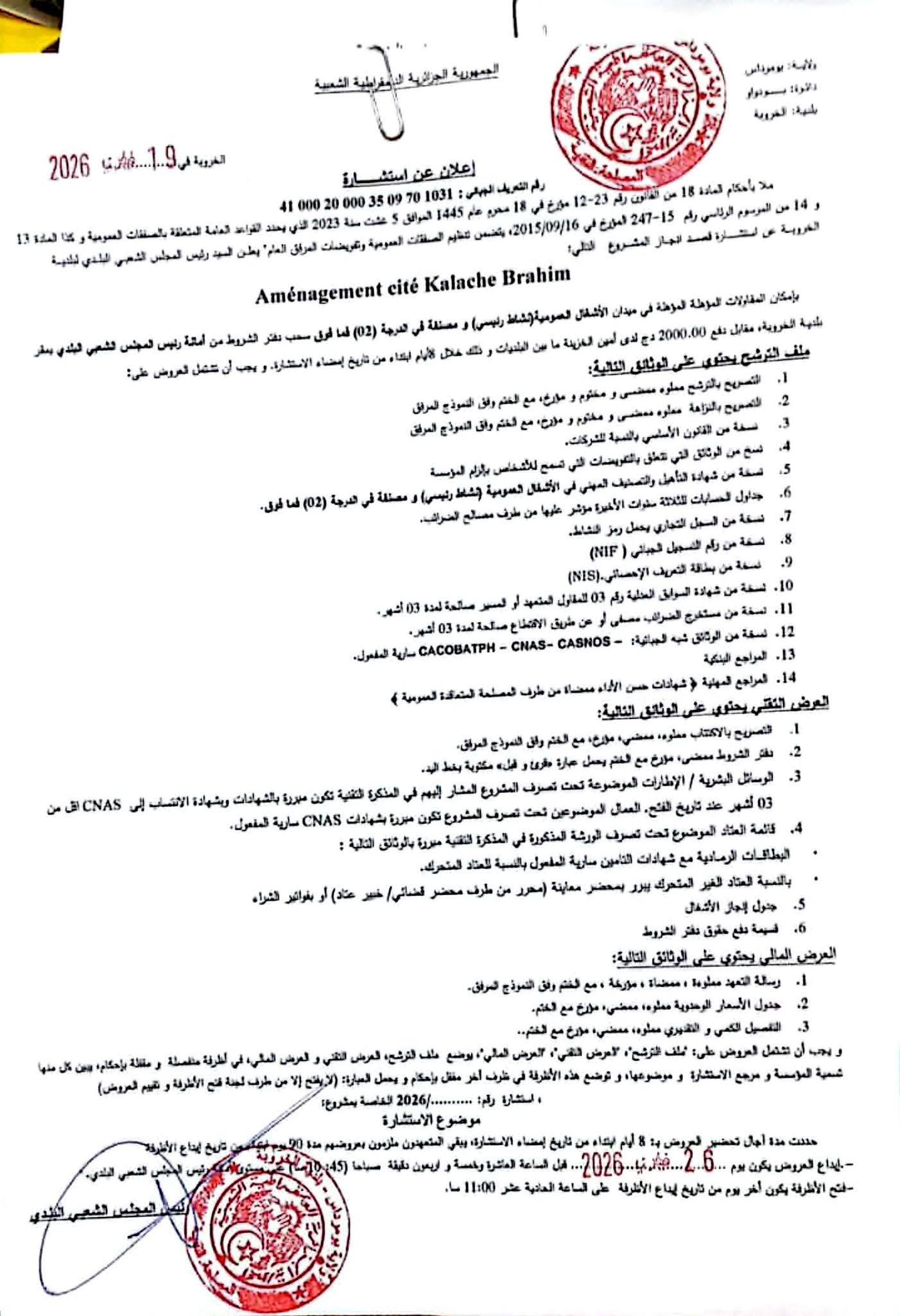 يعلن السيد رئيس المجلس الشعبي البلدي لبلدية الخروبة عن استشارة لانجاز المشروع التالي