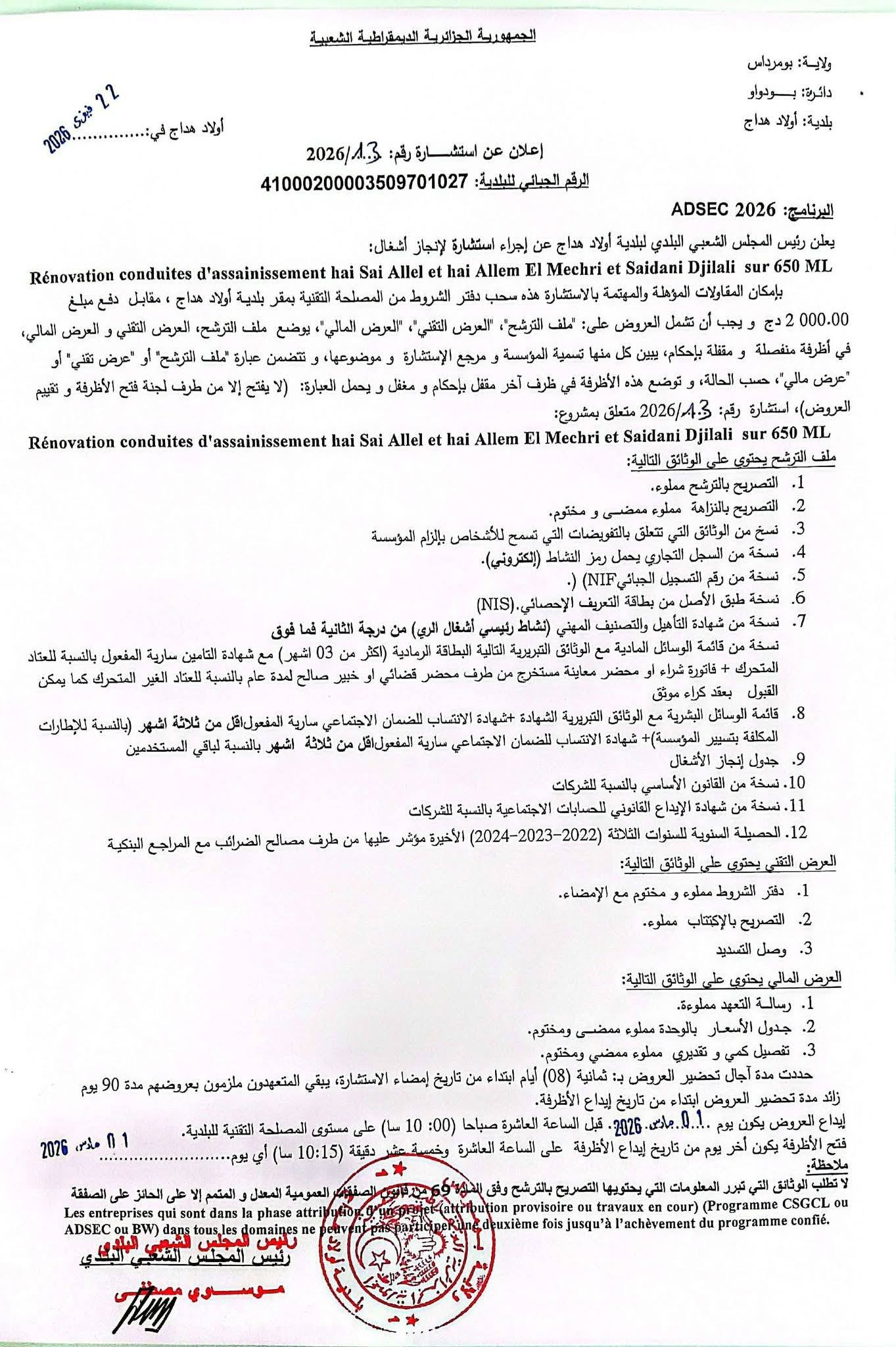 يعلن السيد رئيس المجلس الشعبي البلدي لبلدية أولاد هداج عن استشارة رقم 13 لانجاز المشروع التالي