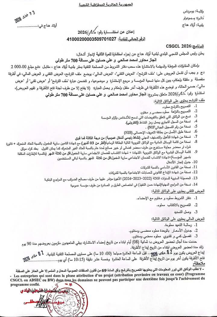 يعلن السيد رئيس المجلس الشعبي البلدي لبلدية أولاد هداج عن استشارة رقم 15 لانجاز المشروع التالي