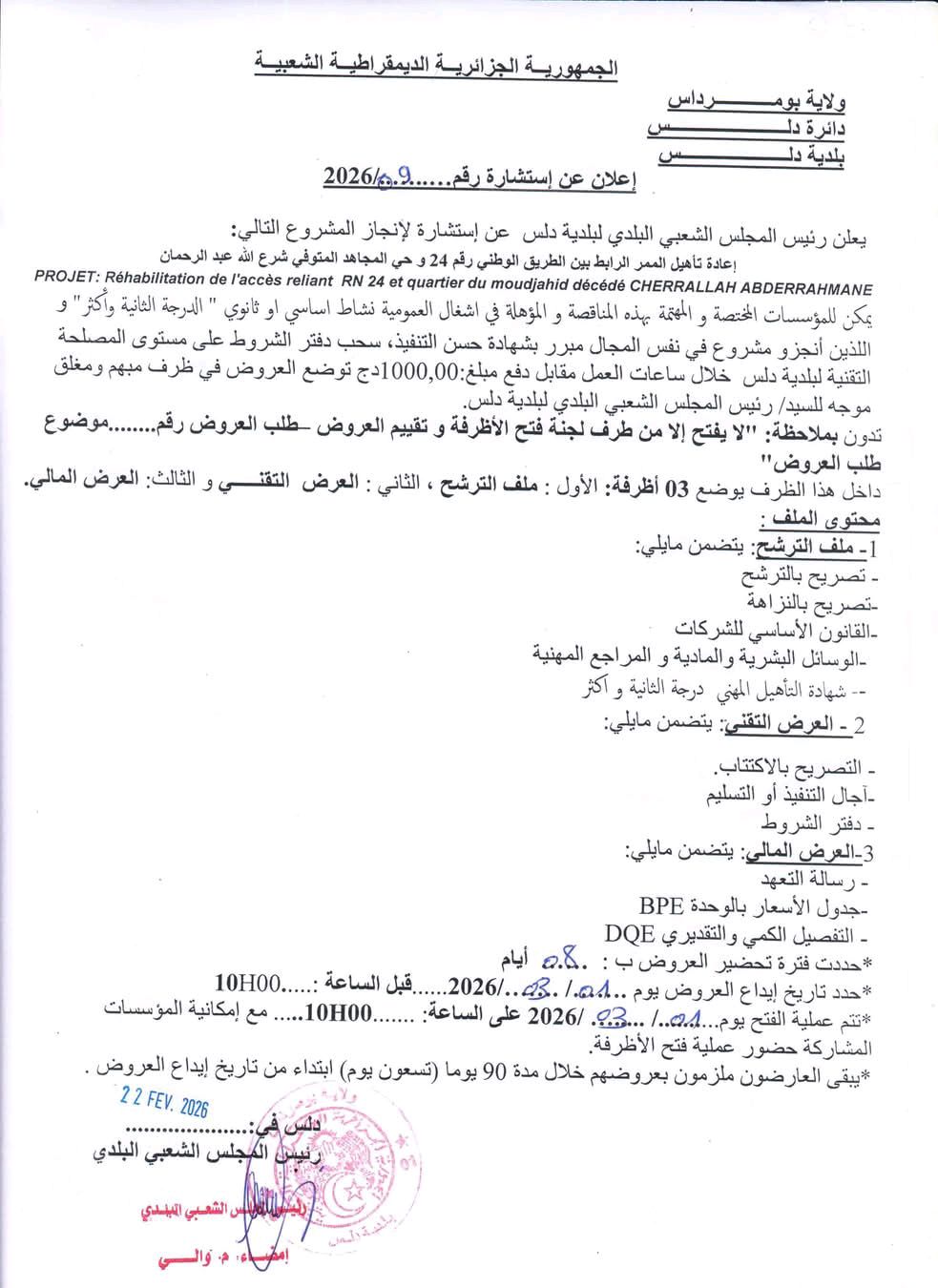 يعلن السيد رئيس المجلس الشعبي البلدي لبلدية دلس عن استشارة رقم 09 لانجاز المشروع التالي