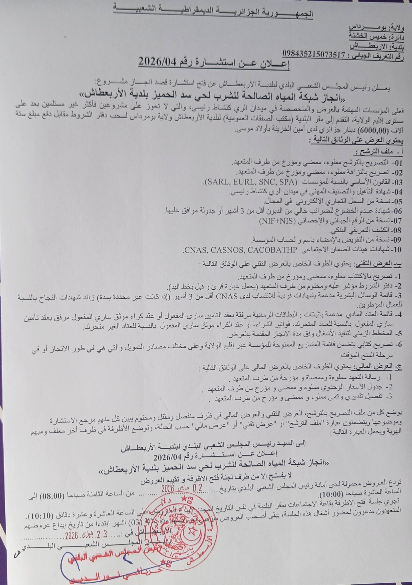 يعلن السيد رئيس المجلس الشعبي البلدي لبلدية الأربعطاش عن استشارة رقم 04 لانجاز المشروع التالي