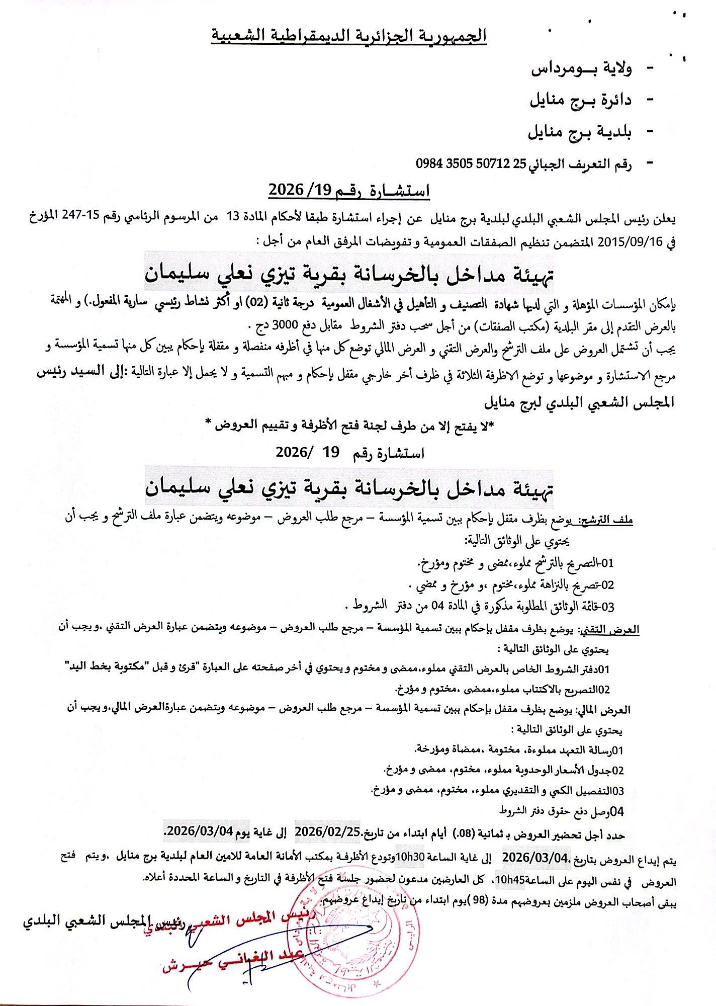 يعلن السيد رئيس المجلس الشعبي البلدي لبلدية برج منايل عن استشارة رقم 19 لانجاز المشروع التالي
