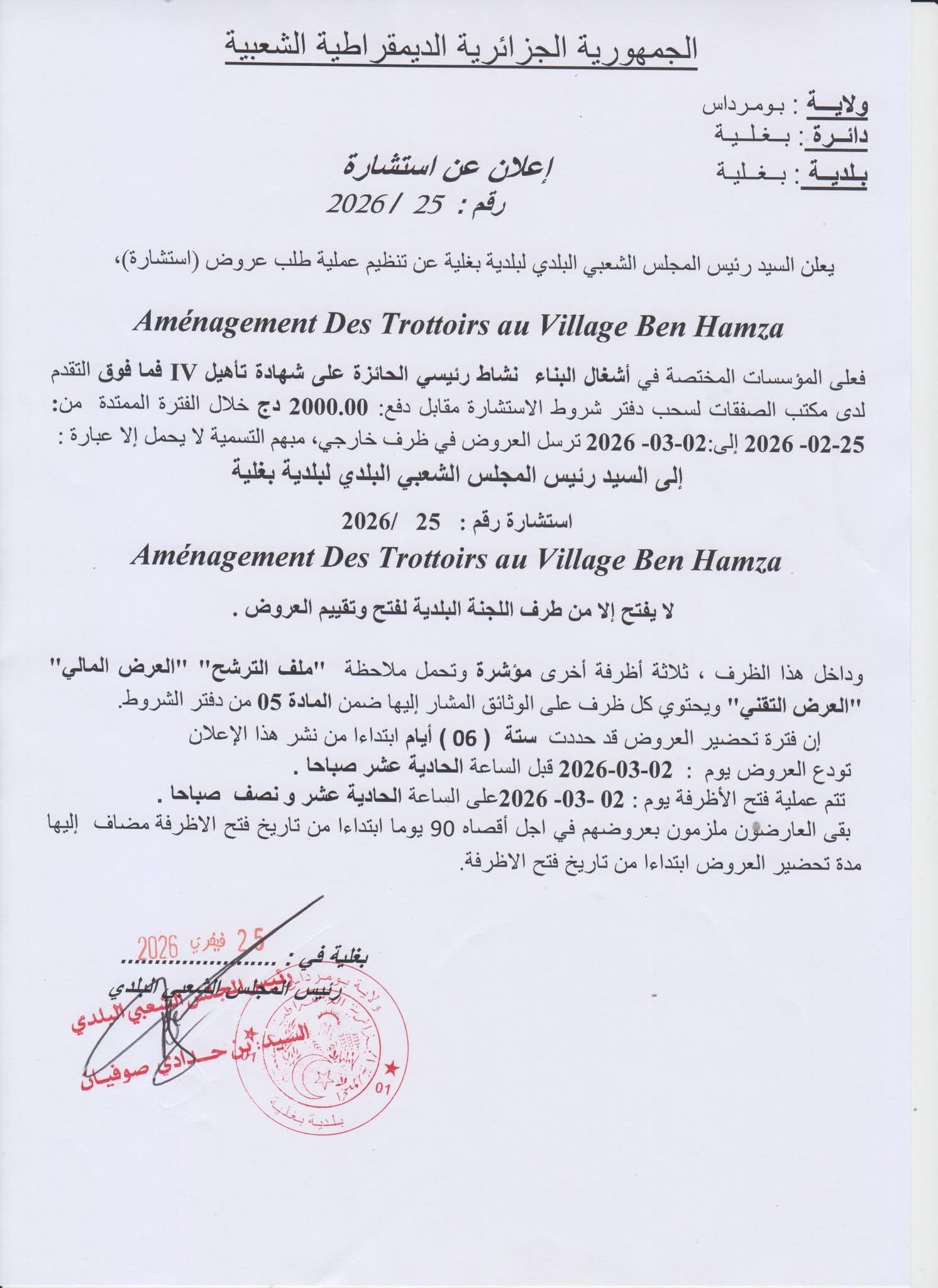 يعلن السيد رئيس المجلس الشعبي البلدي لبلدية بغلية عن استشارة رقم 25 لانجاز المشروع التالي