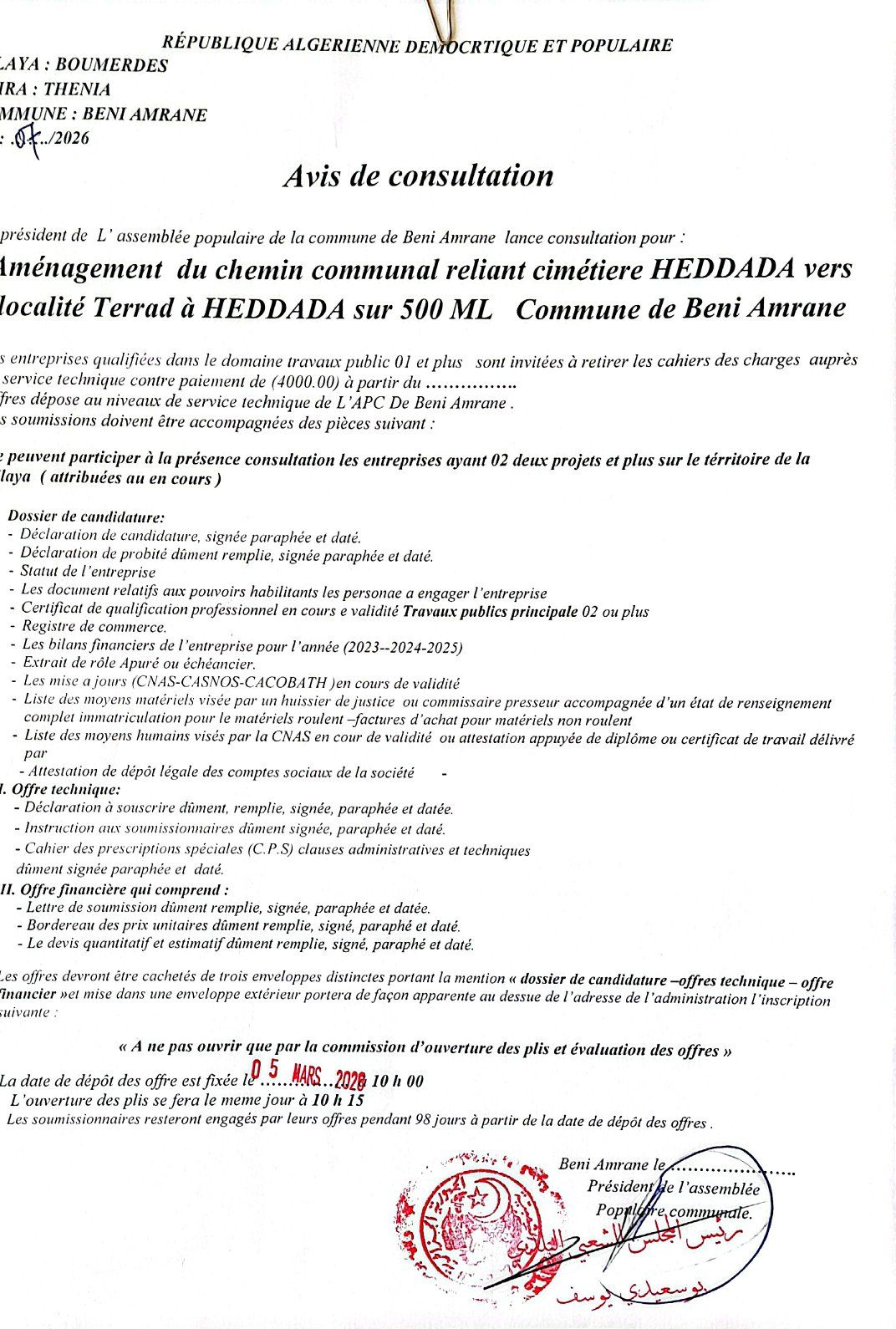 يعلن السيد رئيس المجلس الشعبي البلدي لبلدية بني عمران عن استشارة رقم 07 لانجاز المشروع التالي