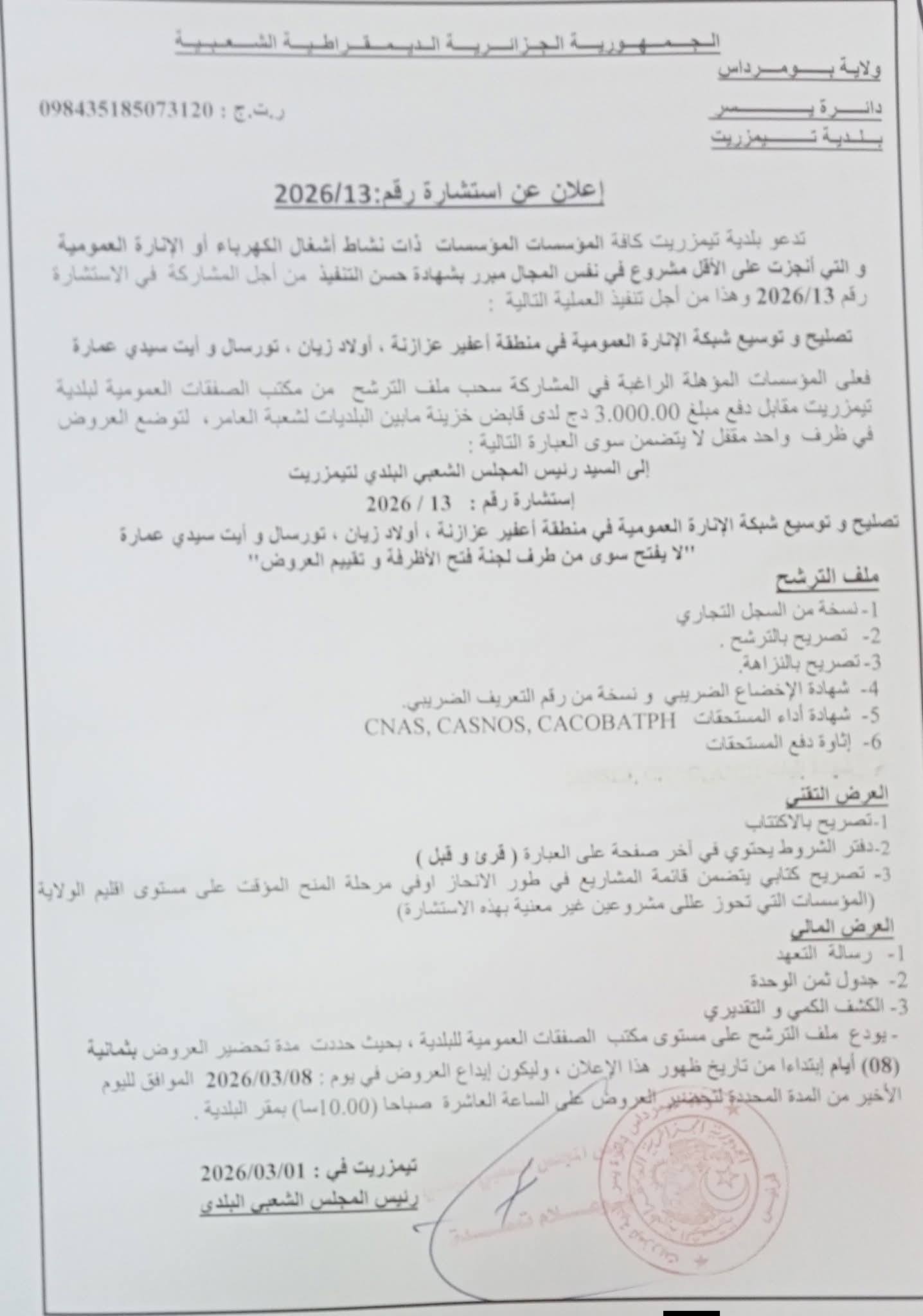 يعلن السيد رئيس المجلس الشعبي البلدي لبلدية تيمزريت عن استشارة رقم 13 لانجاز المشروع التالي