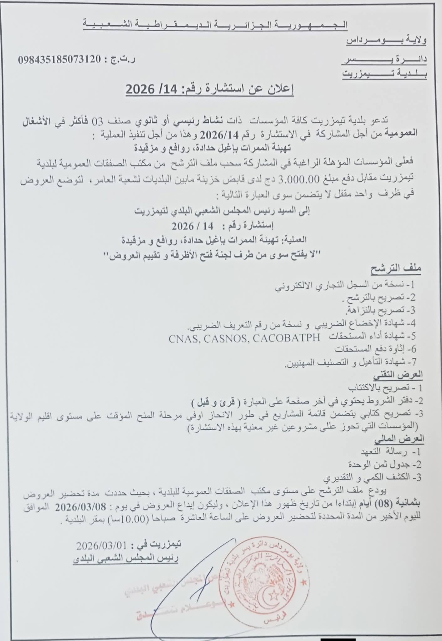 يعلن السيد رئيس المجلس الشعبي البلدي لبلدية تيمزريت عن استشارة رقم 14 لانجاز المشروع التالي