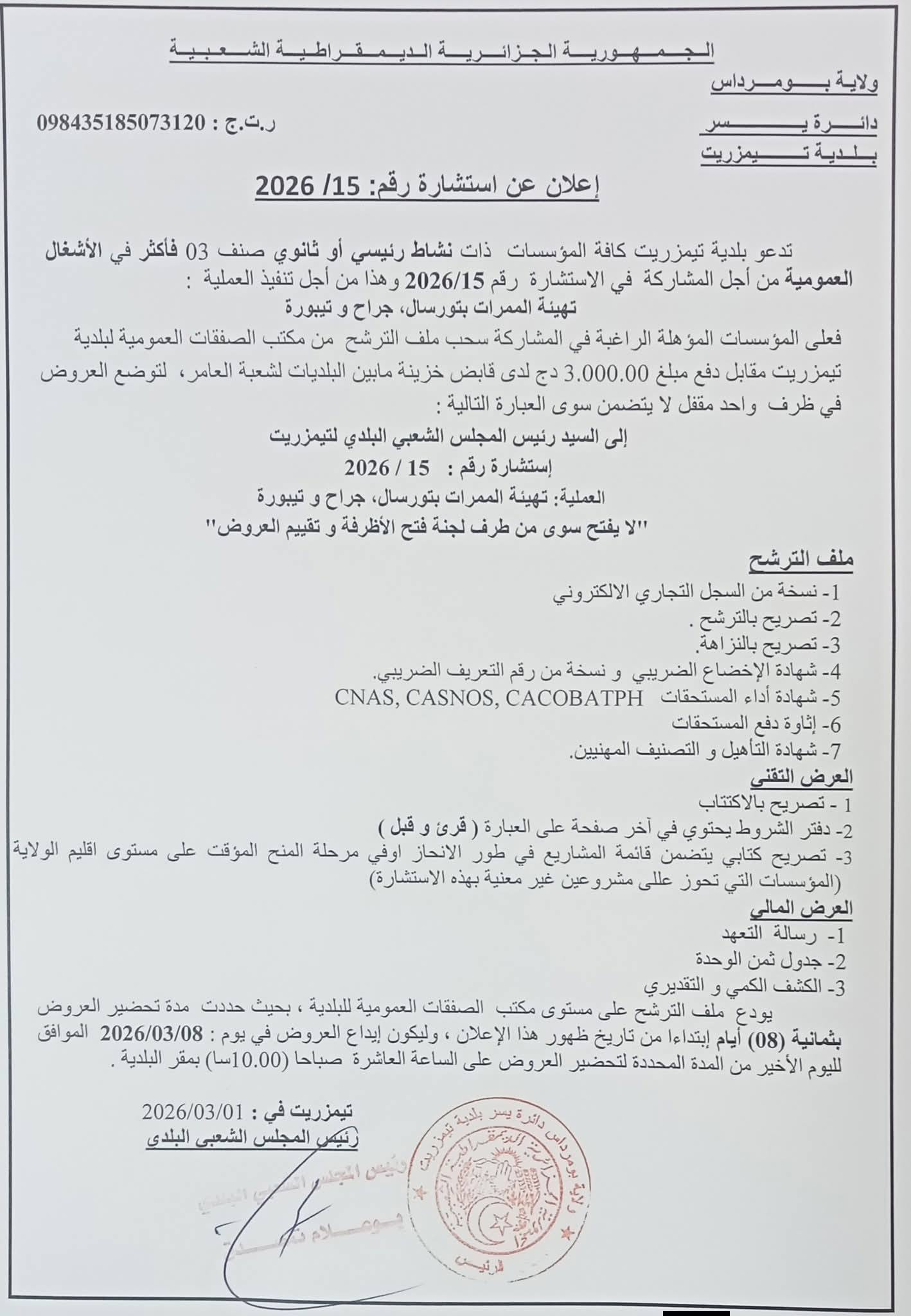 يعلن السيد رئيس المجلس الشعبي البلدي لبلدية تيمزريت عن استشارة رقم 15 لانجاز المشروع التالي