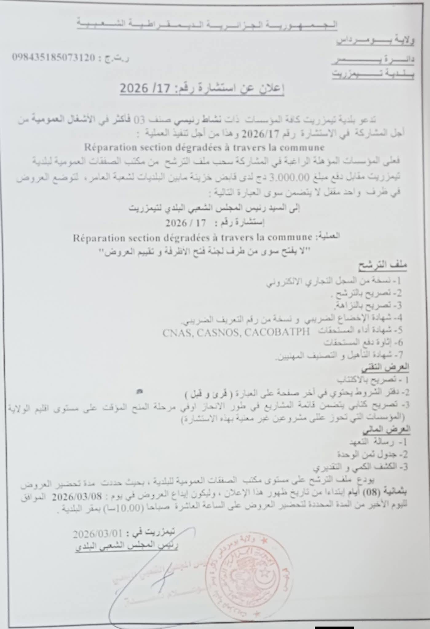 يعلن السيد رئيس المجلس الشعبي البلدي لبلدية تيمزريت عن استشارة رقم 17 لانجاز المشروع التالي