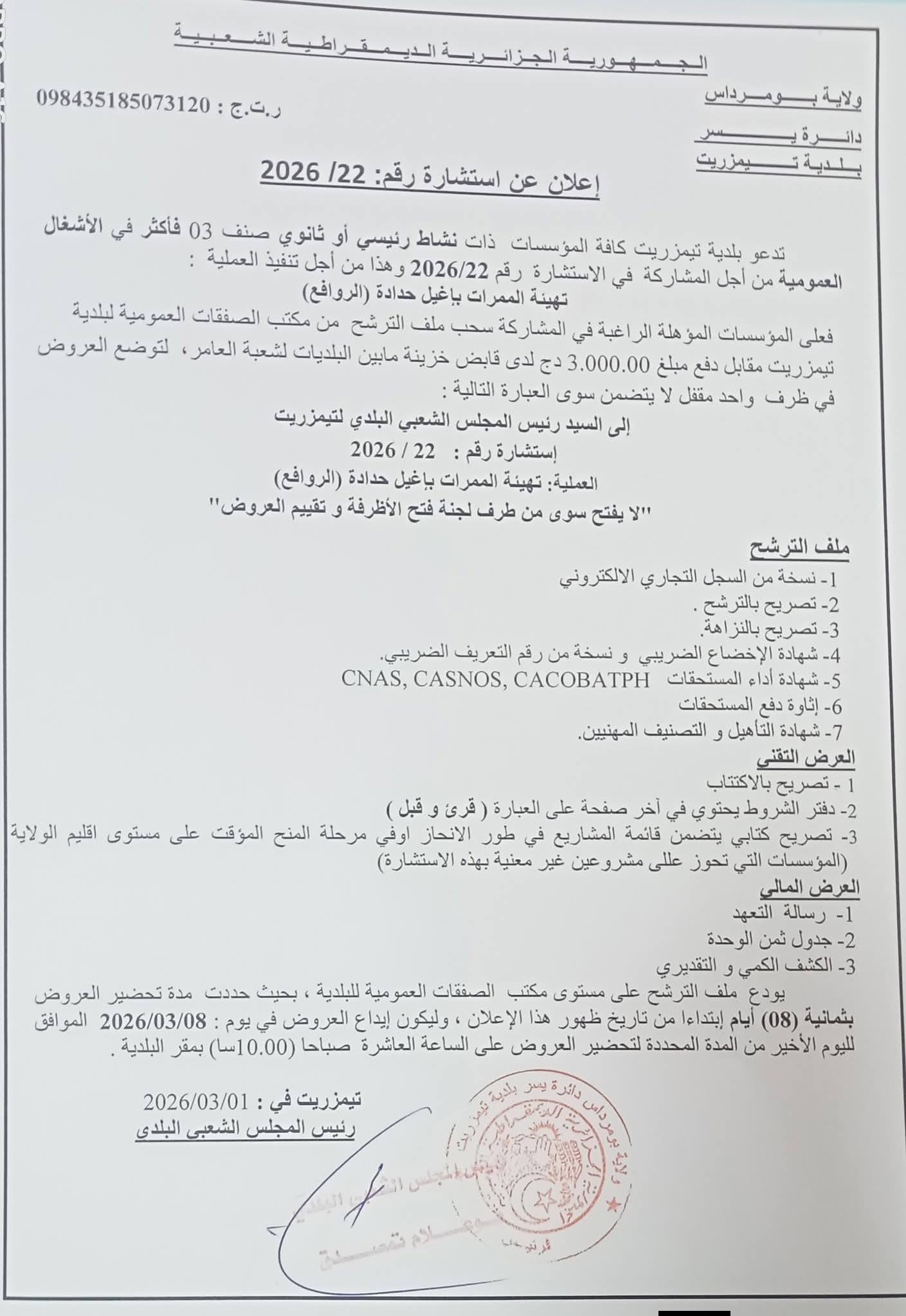 يعلن السيد رئيس المجلس الشعبي البلدي لبلدية تيمزريت عن استشارة رقم 22 لانجاز المشروع التالي