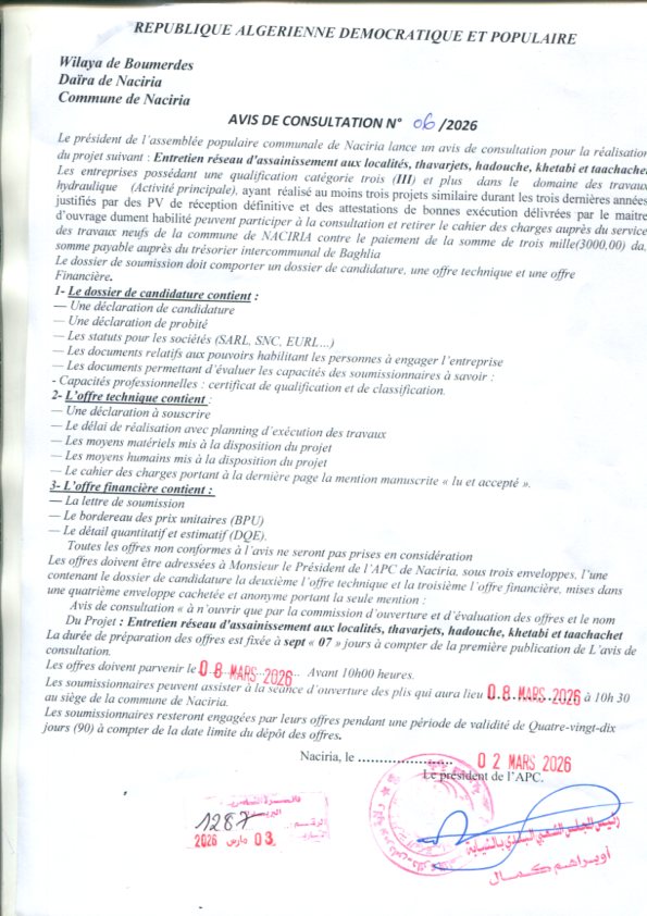 يعلن السيد رئيس المجلس الشعبي البلدي لبلدية الناصرية عن استشارة رقم 06 لانجاز المشروع التالي