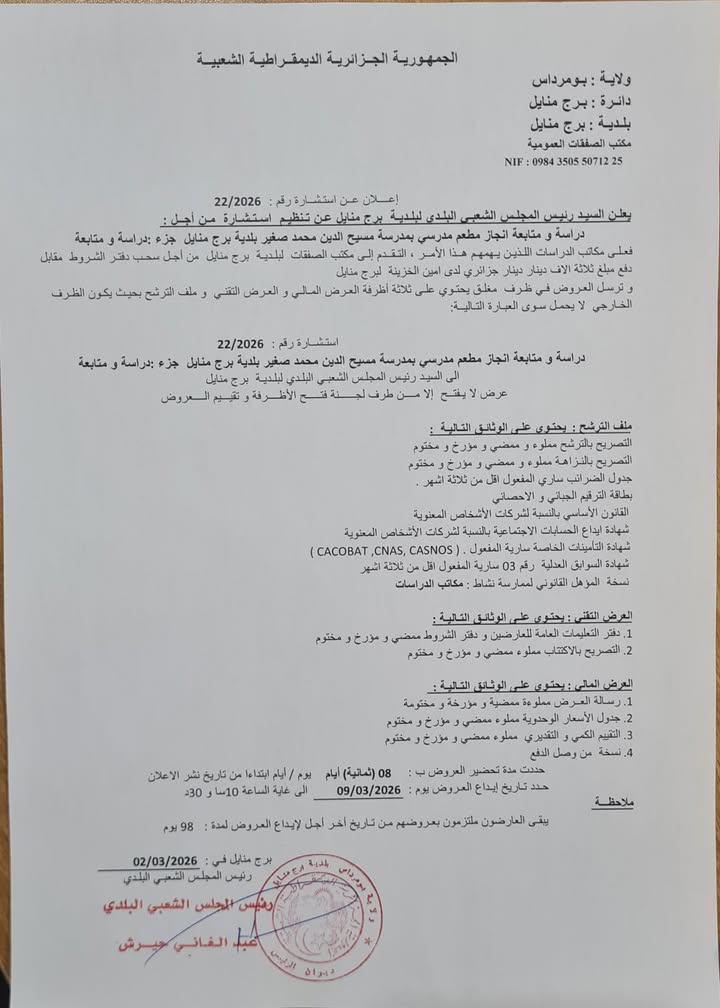 يعلن السيد رئيس المجلس الشعبي البلدي لبلدية برج منايل عن استشارة رقم 22 لانجاز المشروع التالي
