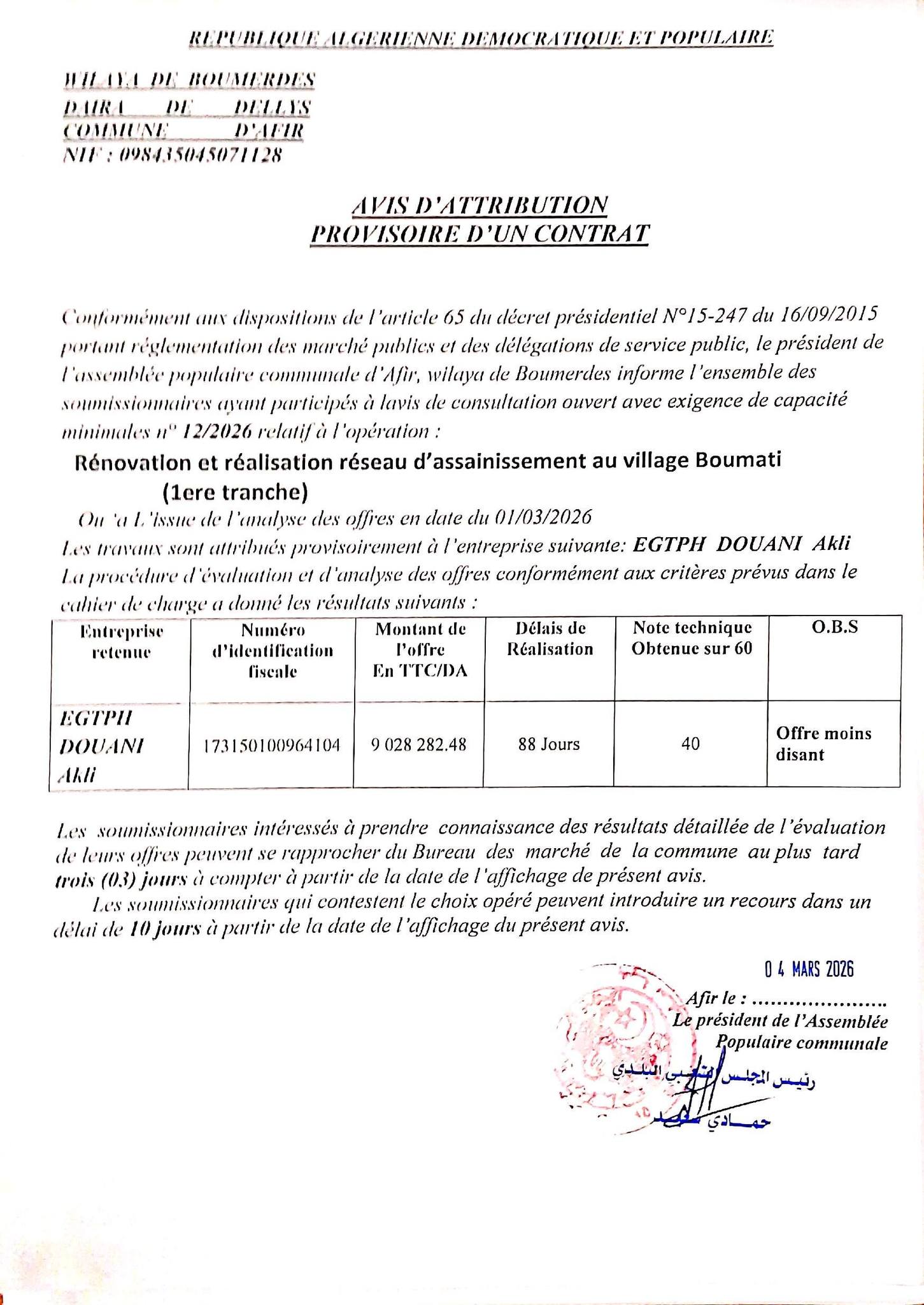 يعلن السيد رئيس المجلس الشعبي البلدي لبلدية أعفير عن منح مؤقت لانجاز المشروع التالي