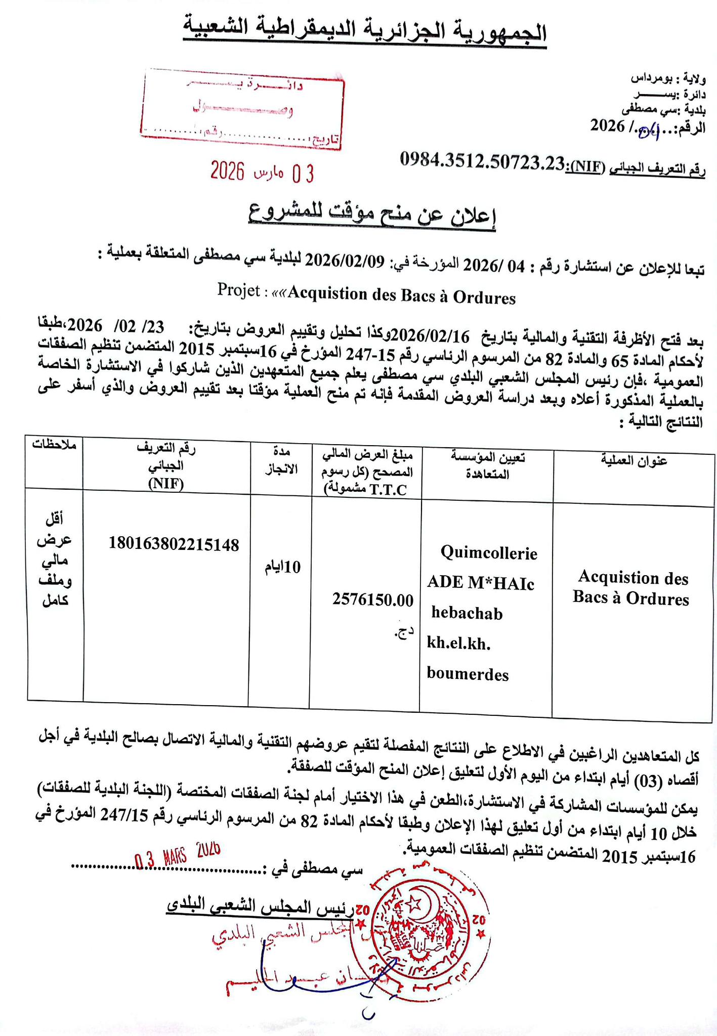 يعلن السيد رئيس المجلس الشعبي البلدي لبلدية سي مصطفى عن منح مؤقت لانجاز المشروع التالي