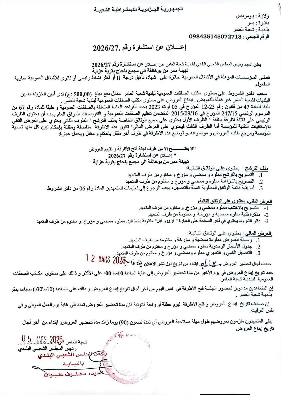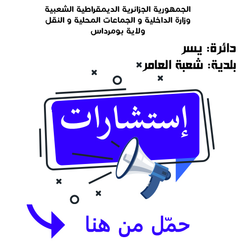 يعلن السيد رئيس المجلس الشعبي البلدي لبلدية شعبة العامر عن استشارة رقم 27 لانجاز المشروع التالي