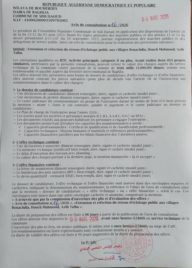 يعلن السيد رئيس المجلس الشعبي البلدي لبلدية سيدي داود عن استشارة رقم 16 لانجاز المشروع التالي