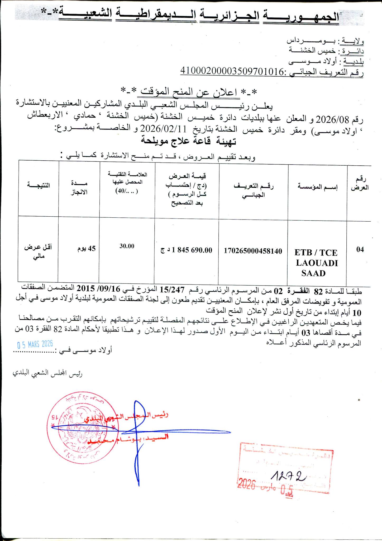 يعلن السيد رئيس المجلس الشعبي البلدي لبلدية أولاد موسى عن منح مؤقت لصفقة تهيئة قاعة علاج مويلحة